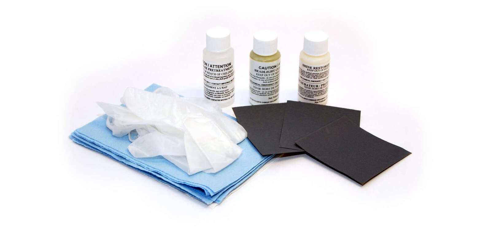 Komplet nudi sve što vam je potrebno za čišćenje dvaju prednjih svjetala. Sadržaj: – 1 boca sredstva za predčišćenje na bazi vode (29,5 ml) – 1 boca sredstva za čišćenje/poliranje (29,5 ml) – 1 boca sredstva za poliranje/voska (29,5 ml) – 1 komad brusnog papira 600 (krupnog zrna) – 1 komad brusnog papira 1500 (srednje granulacije) – 1 komad brusnog papira granulacije 2000 (fine granulacije) – 10 papirnatih ručnika – 1 par rukavica (univerzalne veličine)