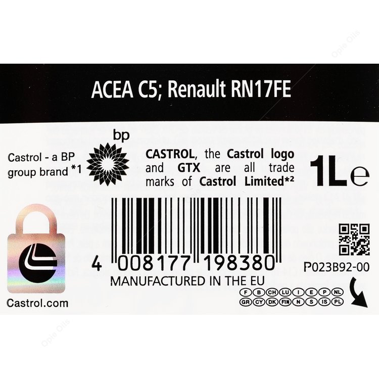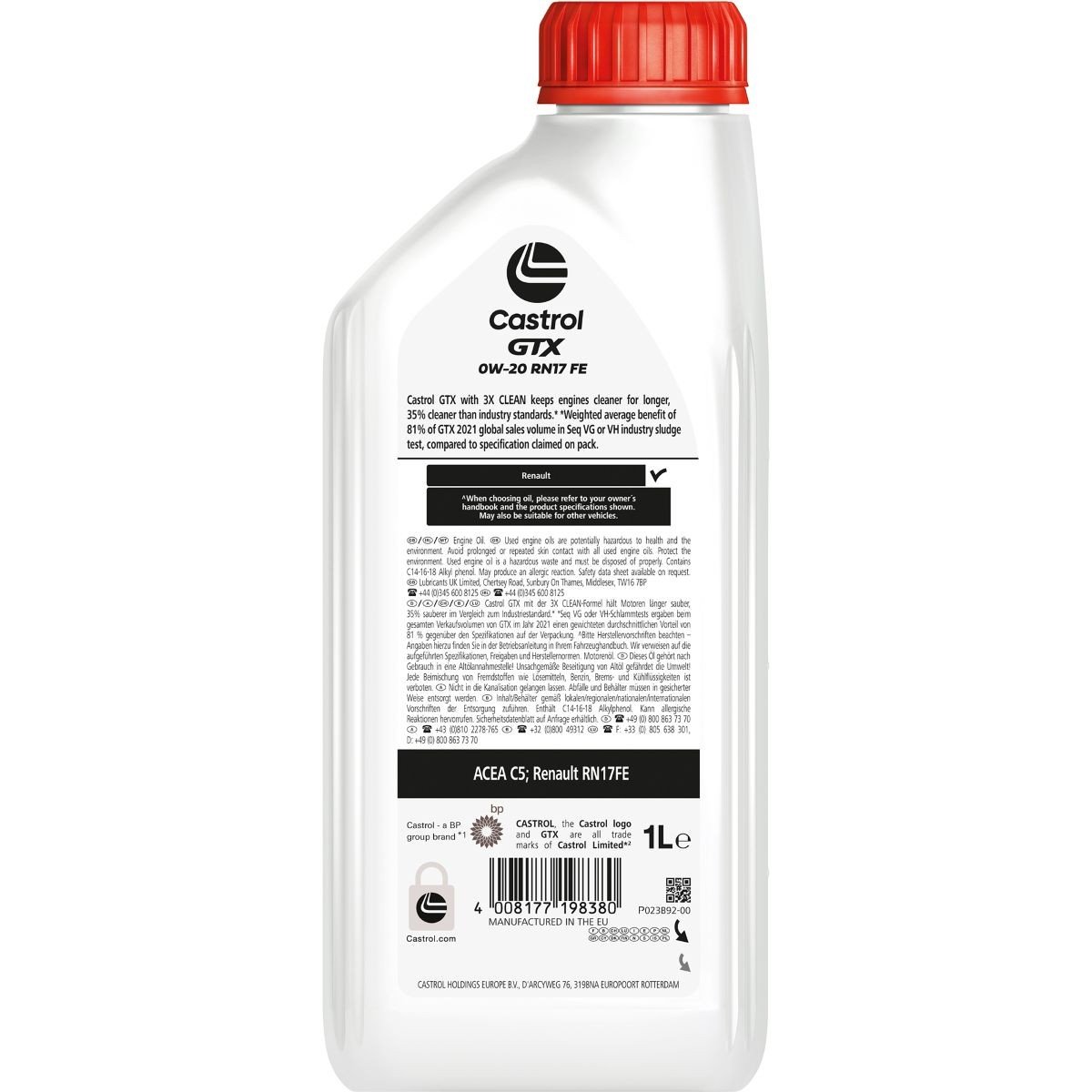 Castrol GTX 0W-20 RN17 FE je visokokvalitetno, potpuno sintetičko motorno ulje posebno formulirano za određene benzinske i dizelske motore koji zahtijevaju specifikaciju Renault RN17 FE. Ovo ulje je razvijeno u suradnji s Renaultom kako bi se osigurale optimalne performanse i zaštita modernih motora.